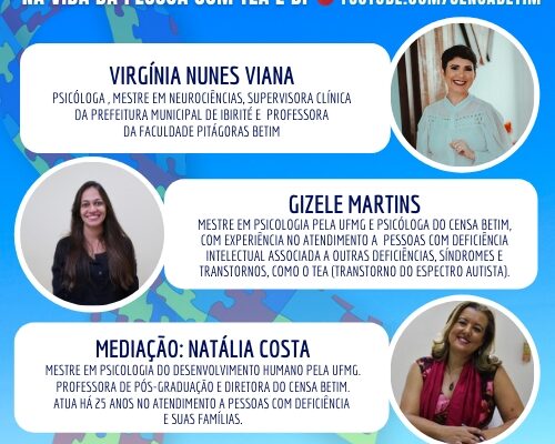Três profissionais que são referências nos cuidados a pessoas com deficiência intelectual compartilharão suas vivências e experiências no dia 04 de maio: a psicóloga mestre em Neurociências, supervisora clínica da Prefeitura Municipal de Ibirité e professora da Faculdade Pitágoras Betim, Virgínia Nunes Viana, e a Mestre em Psicologia pela UFMG e psicóloga do CENSA, Gizele Martins, estarão ao vivo com a psicóloga, diretora do CENSA Betim, Natália Costa. Em uma conversa bem dinâmica, elas falarão sobre como a rotina na vida das pessoas com TEA e DI é importante. Com uma linguagem bem acessível ao público geral, a live contará com uma intérprete de libras simultânea.